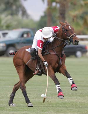 We should all practice hitting the ball at angles away from us as we carry the ball downfield as if there was an opponent trying to ride you off on the far side. If you can cut the ball slightly away from you on your offside or nearside, your chances of retaining possession are much greater. Unfortunately, often times we tend to hit the ball in towards the horse or straight which will make nit much easier for the opponent to either get the ball or ride you over it. I have talked about our tendency to let our mallethead turn too quickly towards the horse on our follow thru. We need to learn to keep the mallethead facing the direction we would like the ball to go as we finish our stroke.